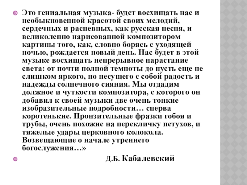 и необыкновенной красотой своих мелодий, сердечных и распевных, как русская песня, и великолепно нарисованной композитором картины того, как, словно борясь с уходящей ночью, рождается новый день. Нас будет в этой музыке восхищать непрерывное нарастание света: от почти полной темноты до пусть еще не слишком яркого, но несущего с собой радость и надежды солнечного сияния. Мы отдадим должное и чуткости композитора, с которого он добавил к своей музыки две очень тонкие изобразительные подробности… сперва коротенькие. Пронзительные фразки гобоя и трубы, очень похожие на перекличку петухов, и тяжелые удары церковного колокола. Возвещающие о начале утреннего богослужения…»
