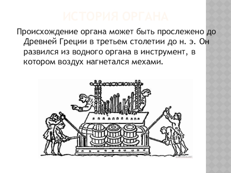 ИСТОРИЯ ОРГАНАПроисхождение органа может быть прослежено до Древней Греции в третьем столетии до н. э. Он развился