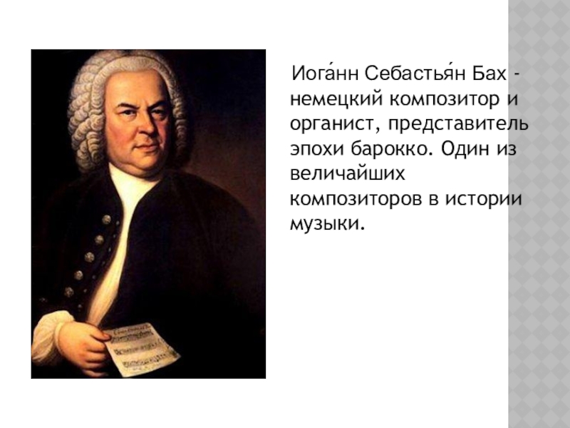 Иога́нн Себастья́н Бах -немецкий композитор и органист, представитель эпохи барокко. Один из величайших композиторов в