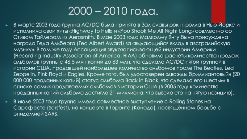 в Зал славы рок-н-ролла в Нью-Йорке и исполнила свои хиты «Highway to Hell» и «You Shook Me All Night Long» совместно со Стивом Тайлером из Aerosmith. В мае 2003 года Малколму Янгу была присуждена награда Теда Альберта (Ted Albert Award) за «выдающийся вклад в австралийскую музыку». В том же году Ассоциация звукозаписывающей индустрии Америки (Recording Industry Association of America, RIAA) обновила расчёты количества продаж альбомов группы с 46,5 млн копий до 63 млн, что сделало AC/DC пятой группой в истории США, продавшей наибольшее количество альбомов после The Beatles, Led Zeppelin, Pink Floyd и Eagles. Кроме того, был удостоверен «дважды бриллиантовый» (20 000 000 проданных копий) статус альбома Back in Black, что сделало его шестым в списке самых продаваемых альбомов в истории США (в 2005 году количество проданных копий альбома достигло 21 миллиона, что вывело его на пятую позицию).