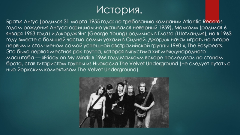 Records годом рождения Ангуса официально указывался неверный 1959), Малколм (родился 6 января 1953 года) и Джордж Янг (George Young) родились в Глазго (Шотландия), но в 1963 году вместе с большей частью семьи уехали в Сидней. Джордж начал играть на гитаре первым и стал членом самой успешной австралийской группы 1960-х, The Easybeats. Это была первая местная рок-группа, которая выпустила хит международного масштаба — «Friday on My Mind» в 1966 году.Малколм вскоре последовал по стопам брата, став гитаристом группы из Ньюкасла The Velvet Underground (не следует путать с нью-йоркским коллективом The Velvet Underground).