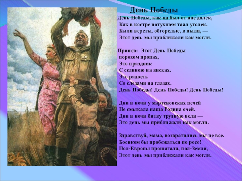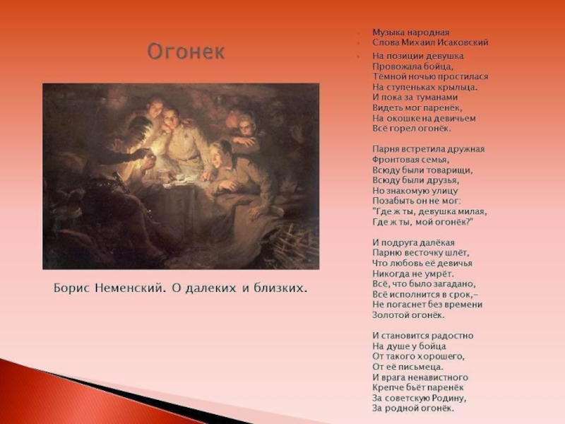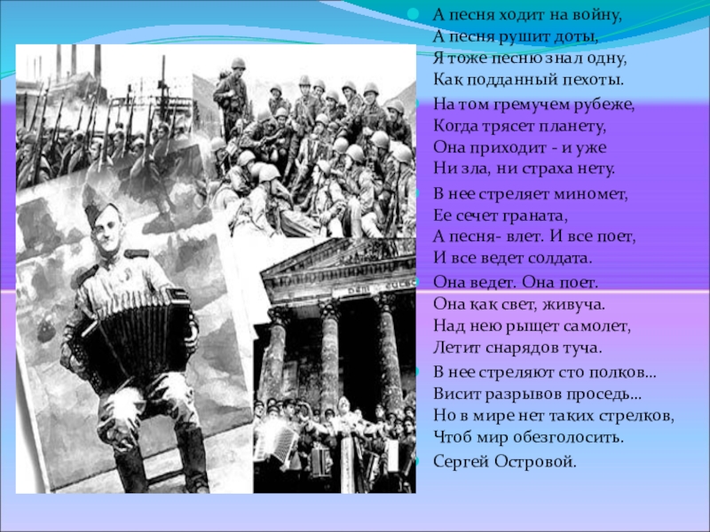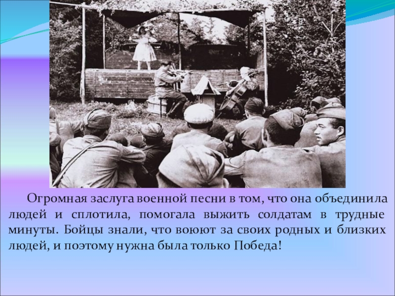 Слайд 14 Огромная заслуга военной песни в том, что она объединила людей