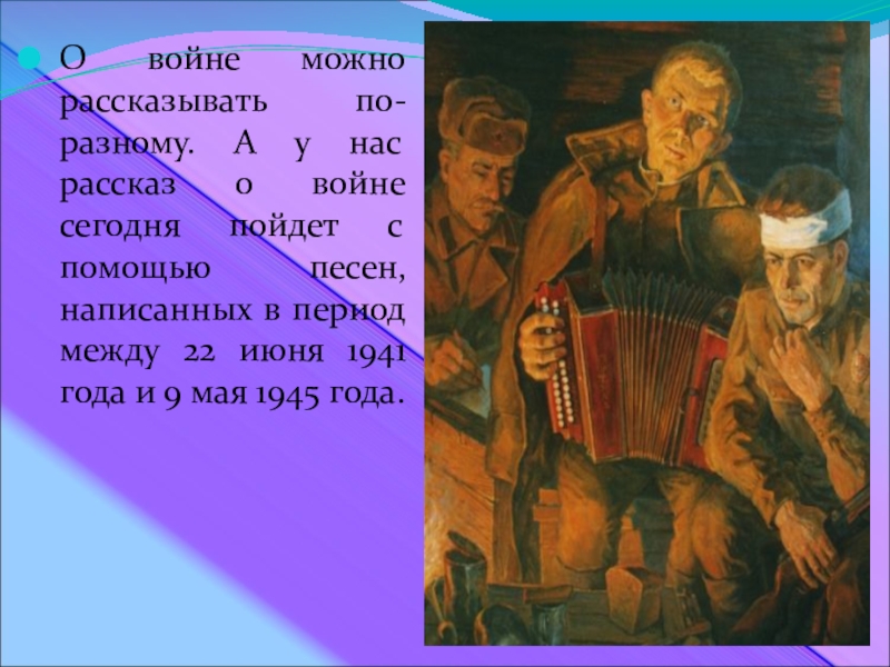 сегодня пойдет с помощью песен, написанных в период между 22 июня 1941 года и 9 мая 1945 года.