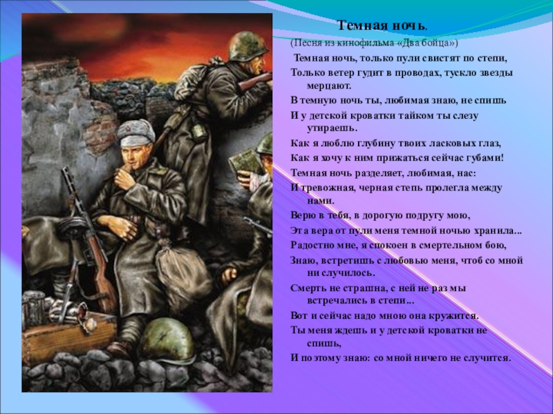 в дни сражений, молодое поколение называет песнями отцов и дедов. Но появляются новые песни о войне, написанные поэтами и композиторами, которые не лежали в окопах , не мерзли в землянках, не ходили в атаку.