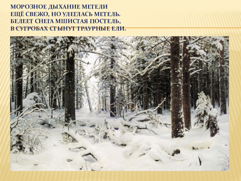 Морозное дыхание метели Ещё свежо, но улеглась метель. Белеет снега мшистая постель, В сугробах стынут траурные ели.