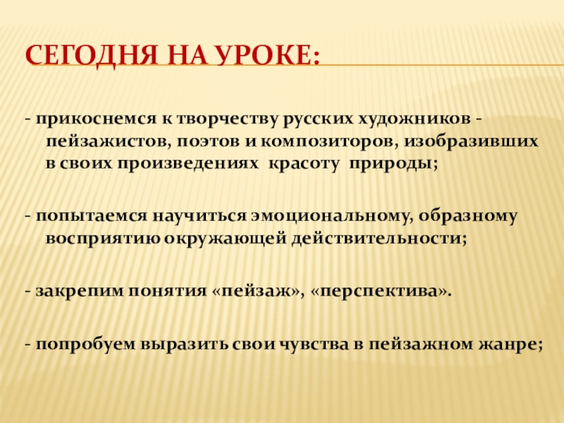 СЕГОДНЯ НА УРОКЕ:- прикоснемся к творчеству русских художников - пейзажистов, поэтов и композиторов, изобразивших в своих произведениях