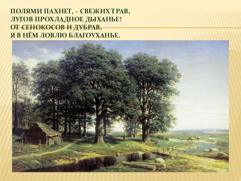 Слайд 7Полями пахнет, – свежих трав, Лугов прохладное дыханье! От сенокосов и дубрав, Я в