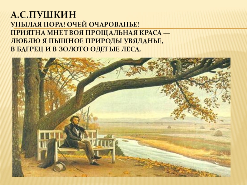 Слайд 9А.С.Пушкин Унылая пора! Очей очарованье! Приятна мне твоя прощальная краса — Люблю я пышное
