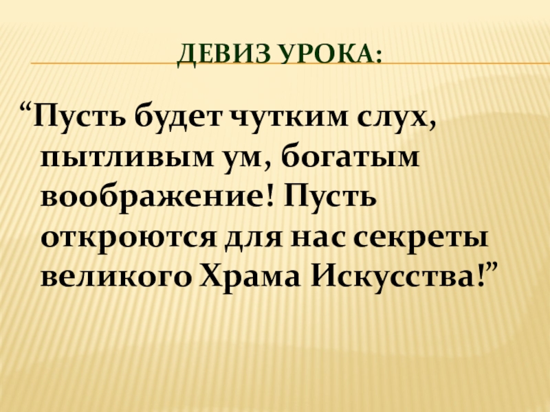 Девиз урока: “Пусть будет чутким слух, пытливым ум, богатым воображение! Пусть откроются для нас секреты великого Храма