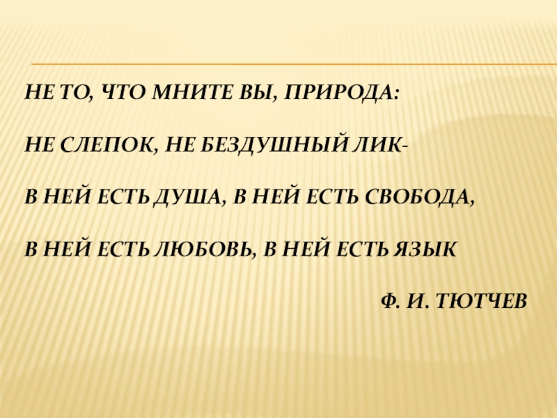 Слайд 23Не то, что мните вы, природа: Не слепок, не бездушный лик- В ней