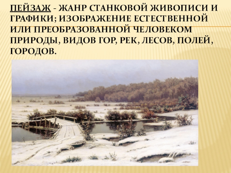 Слайд 13Пейзаж - жанр станковой живописи и графики; изображение естественной или преобразованной
