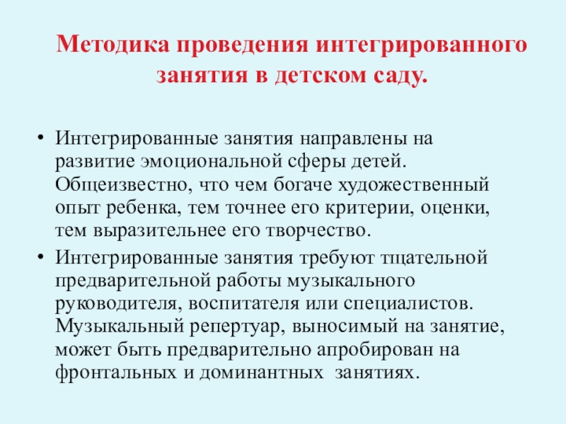 Интегрированные занятия требуют тщательной предварительной работы музыкального руководителя, воспитателя или специалистов. Музыкальный репертуар, выносимый на занятие, может быть предварительно апробирован на фронтальных и доминантных занятиях.