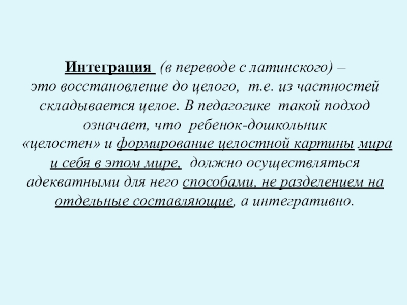 из частностей складывается целое. В педагогике такой подход означает, что ребенок-дошкольник «целостен» и формирование целостной картины мира и себя в этом мире, должно осуществляться адекватными для него способами, не разделением на отдельные составляющие, а интегративно.