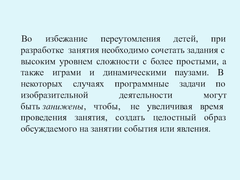 высоким уровнем сложности с более простыми, а также играми и динамическими паузами. В некоторых случаях программные задачи по изобразительной деятельности могут быть занижены, чтобы, не увеличивая время проведения занятия, создать целостный образ обсуждаемого на занятии события или явления.