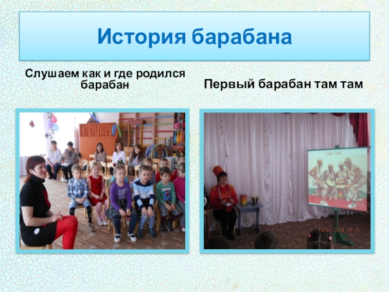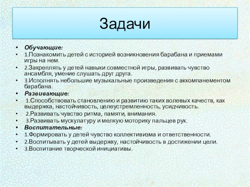 1.Познакомить детей с историей возникновения барабана и приемами игры на