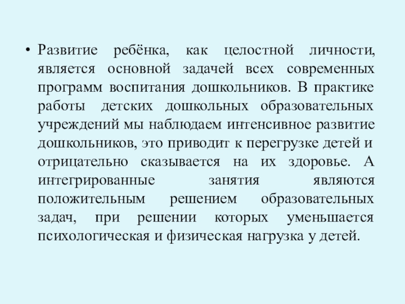 воспитания дошкольников. В практике работы детских дошкольных образовательных учреждений мы наблюдаем интенсивное развитие дошкольников, это приводит к перегрузке детей и отрицательно сказывается на их здоровье. А интегрированные занятия являются положительным решением образовательных задач, при решении которых уменьшается психологическая и физическая нагрузка у детей.