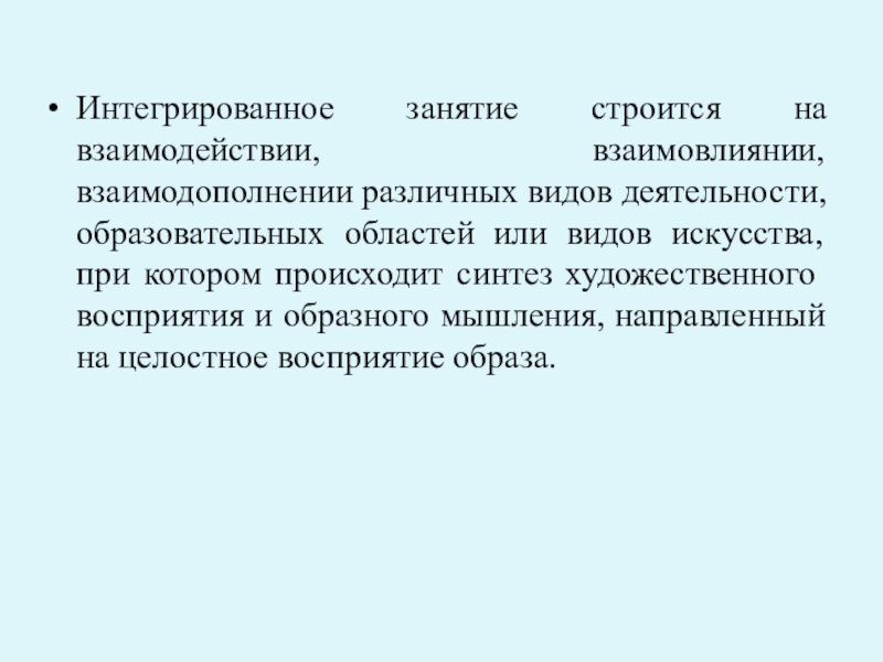 Слайд 14Интегрированное занятие строится на взаимодействии, взаимовлиянии, взаимодополнении различных видов деятельности, образовательных
