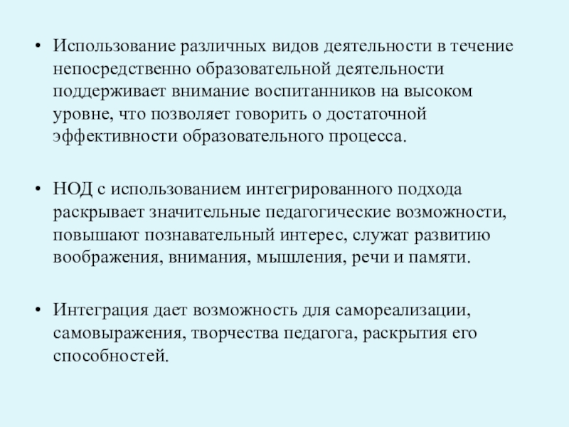 НОД с использованием интегрированного подхода раскрывает значительные педагогические возможности, повышают познавательный интерес, служат развитию воображения, внимания, мышления, речи и памяти.