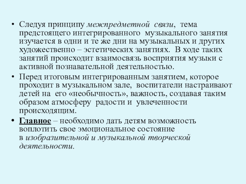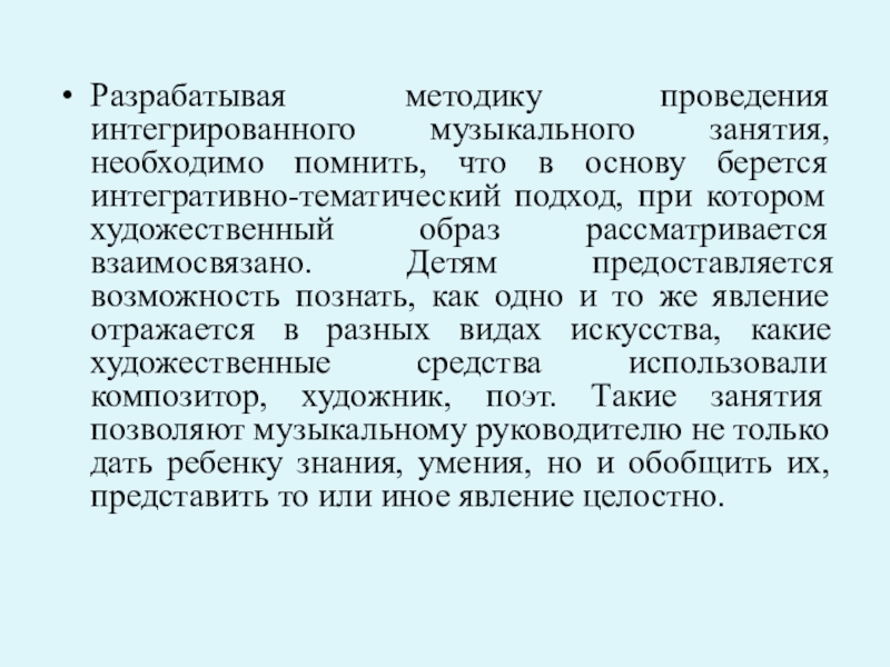 Слайд 13Разрабатывая методику проведения интегрированного музыкального занятия, необходимо помнить, что в основу