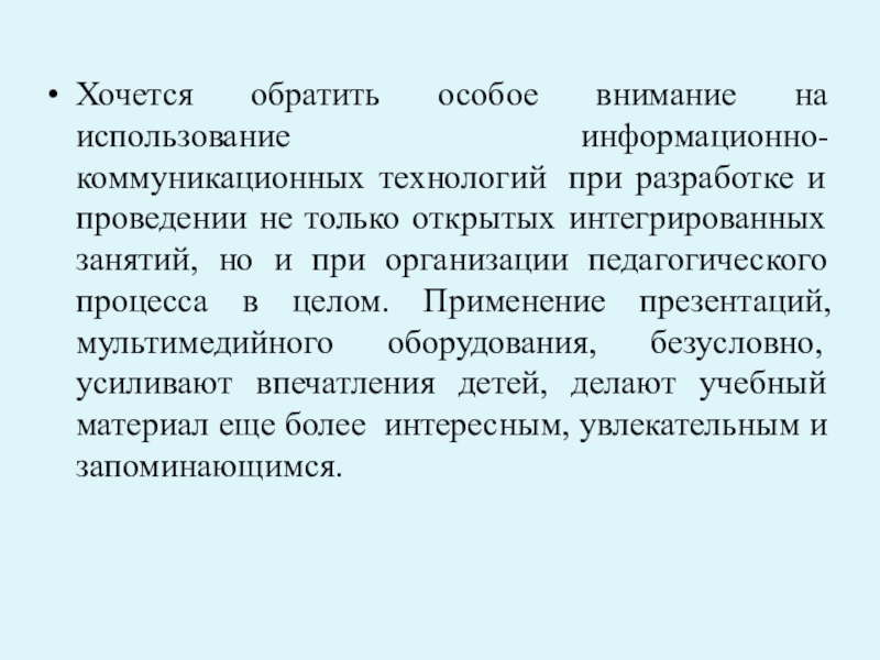 проведении не только открытых интегрированных занятий, но и при организации педагогического процесса в целом. Применение презентаций, мультимедийного оборудования, безусловно, усиливают впечатления детей, делают учебный материал еще более интересным, увлекательным и запоминающимся.