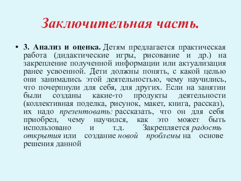 3. Анализ и оценка. Детям предлагается практическая работа (дидактические игры, рисование