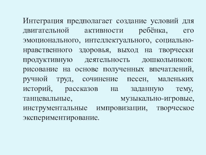 Слайд 6Интеграция предполагает создание условий для двигательной активности ребёнка, его эмоционального, интеллектуального,
