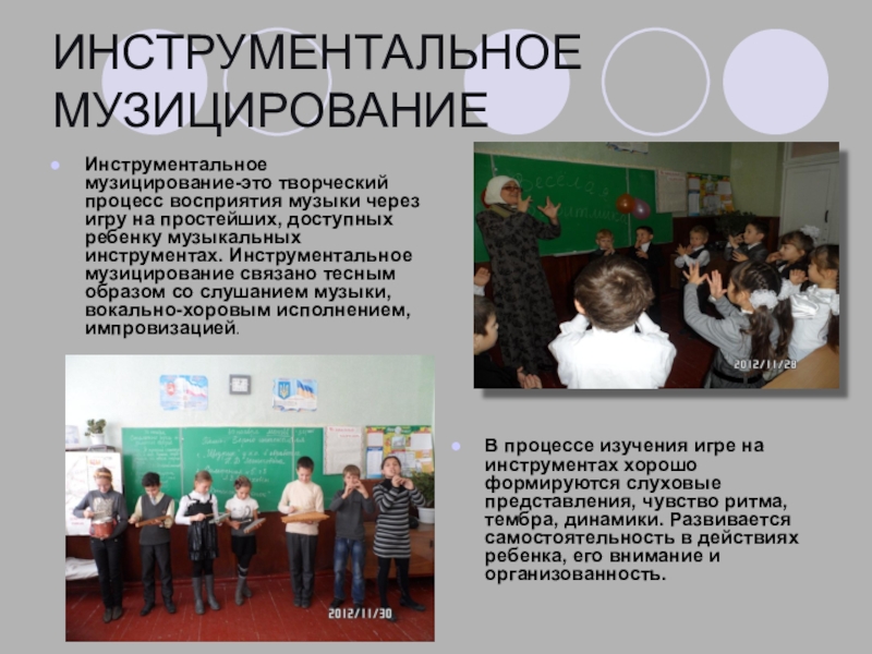 В процессе изучения игре на инструментах хорошо формируются слуховые представления, чувство ритма, тембра, динамики. Развивается самостоятельность в действиях ребенка, его внимание и организованность.