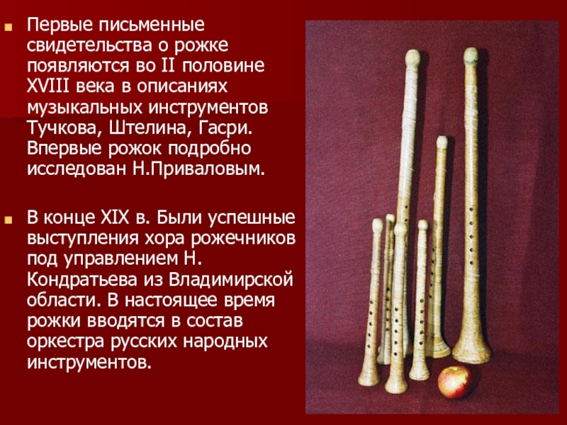 Слайд 17Первые письменные свидетельства о рожке появляются во II половине XVIII века