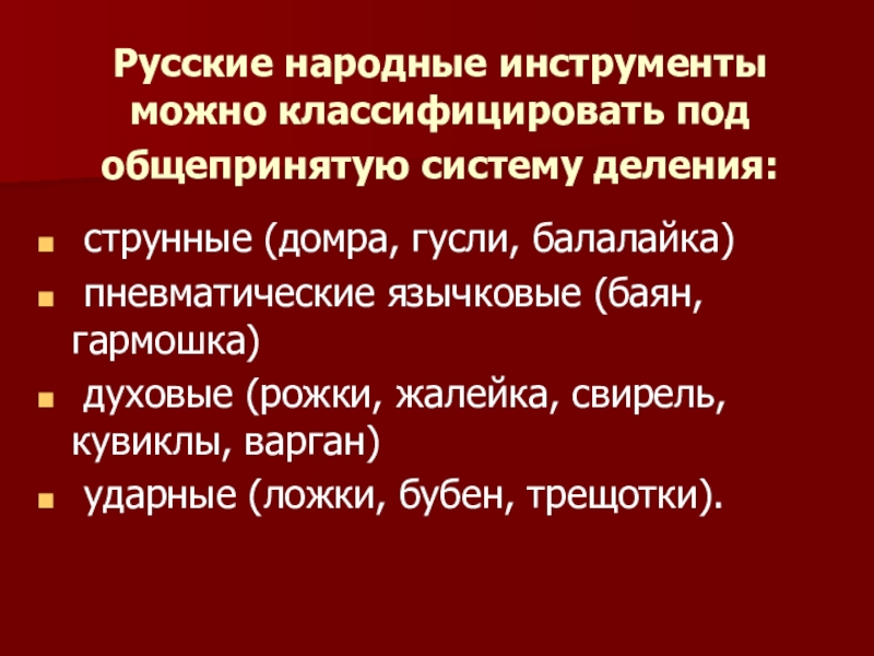 Слайд 2Русские народные инструменты можно классифицировать под общепринятую систему деления: