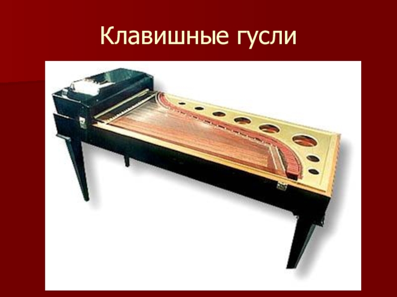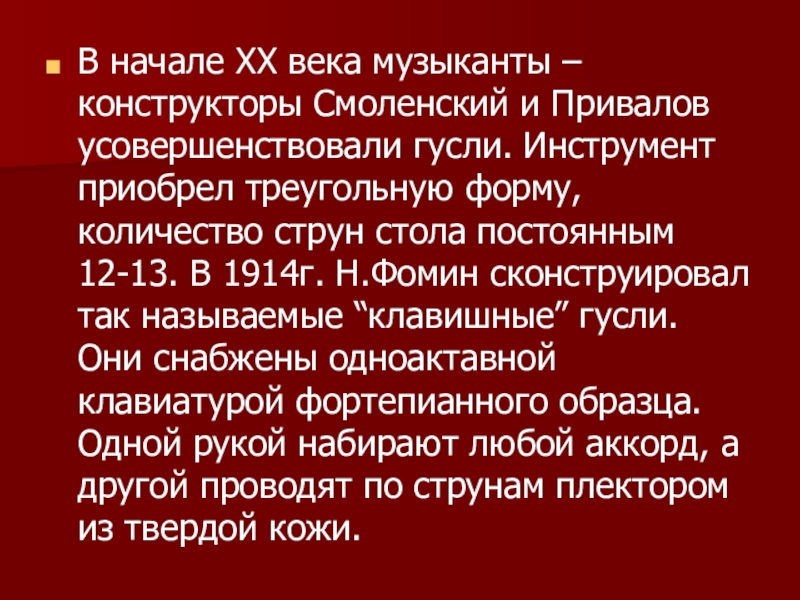 гусли. Инструмент приобрел треугольную форму, количество струн стола постоянным 12-13. В 1914г. Н.Фомин сконструировал так называемые “клавишные” гусли. Они снабжены одноактавной клавиатурой фортепианного образца. Одной рукой набирают любой аккорд, а другой проводят по струнам плектором из твердой кожи.