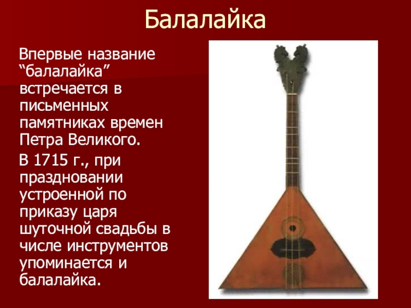 В 1715 г., при праздновании устроенной по приказу царя шуточной свадьбы в числе инструментов упоминается и балалайка.