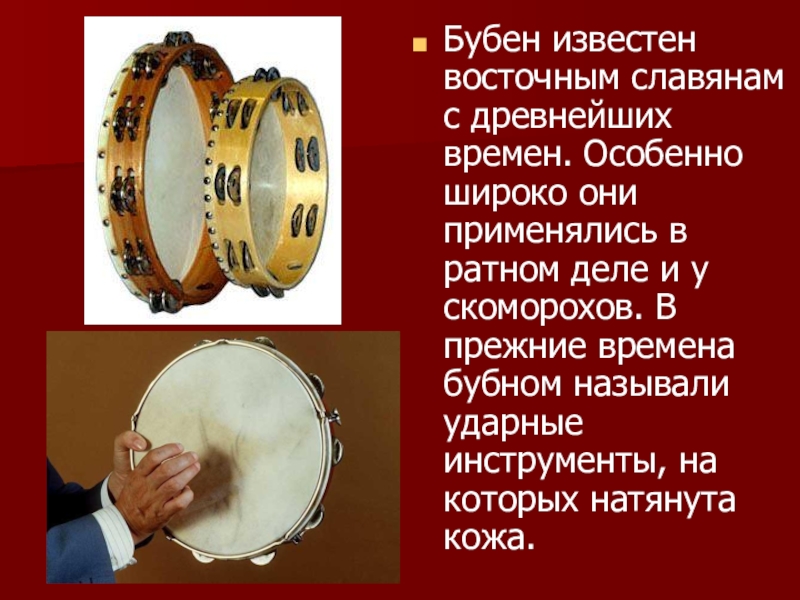 в ратном деле и у скоморохов. В прежние времена бубном называли ударные инструменты, на которых натянута кожа.