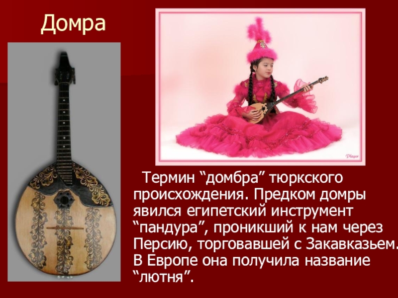 Термин “домбра” тюркского происхождения. Предком домры явился египетский инструмент “пандура”, проникший к нам через Персию, торговавшей с Закавказьем. В Европе она получила название “лютня”.