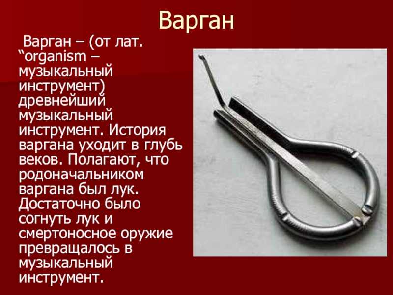 музыкальный инструмент. История варгана уходит в глубь веков. Полагают, что родоначальником варгана был лук. Достаточно было согнуть лук и смертоносное оружие превращалось в музыкальный инструмент.