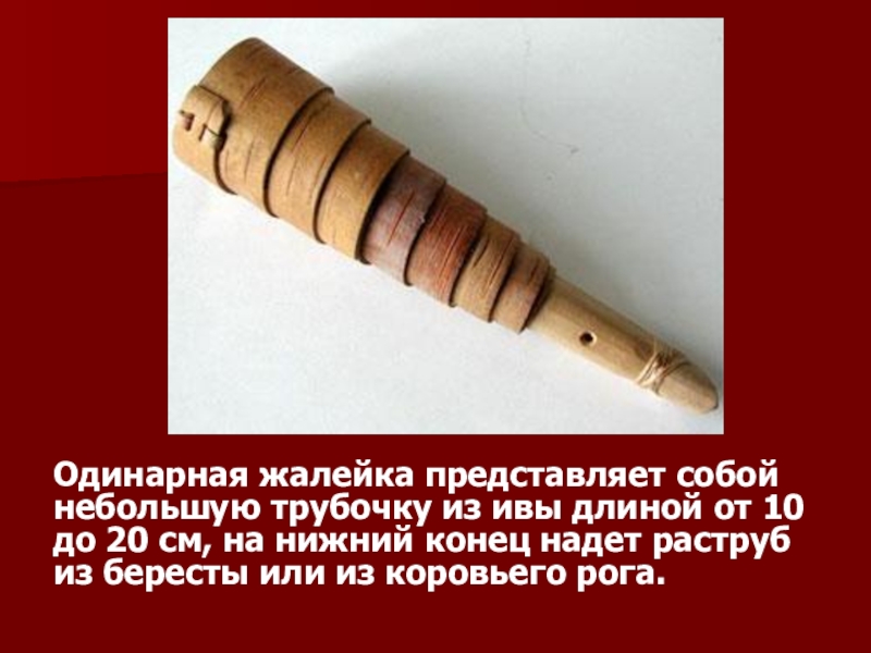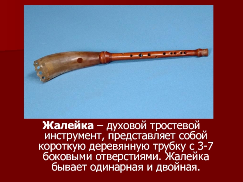 Слайд 18Жалейка – духовой тростевой инструмент, представляет собой короткую деревянную трубку с