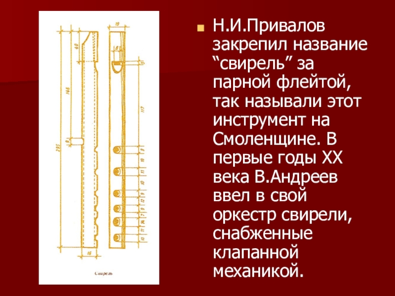 Слайд 22Н.И.Привалов закрепил название “свирель” за парной флейтой, так называли этот инструмент