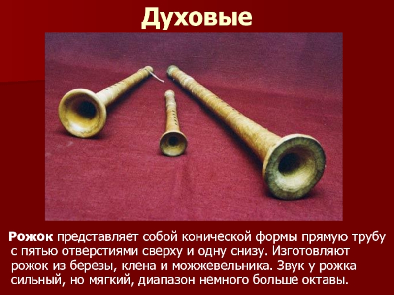 отверстиями сверху и одну снизу. Изготовляют рожок из березы, клена и можжевельника. Звук у рожка сильный, но мягкий, диапазон немного больше октавы.