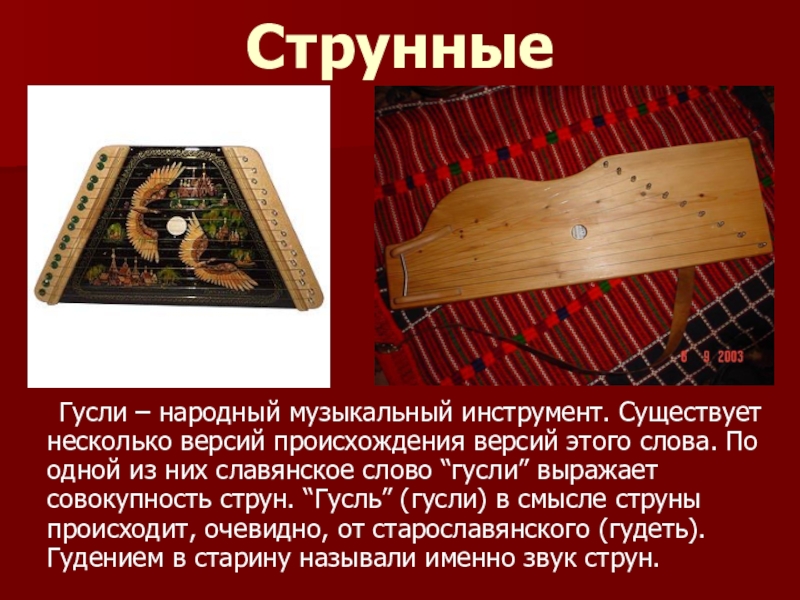 версий происхождения версий этого слова. По одной из них славянское слово “гусли” выражает совокупность струн. “Гусль” (гусли) в смысле струны происходит, очевидно, от старославянского (гудеть). Гудением в старину называли именно звук струн.