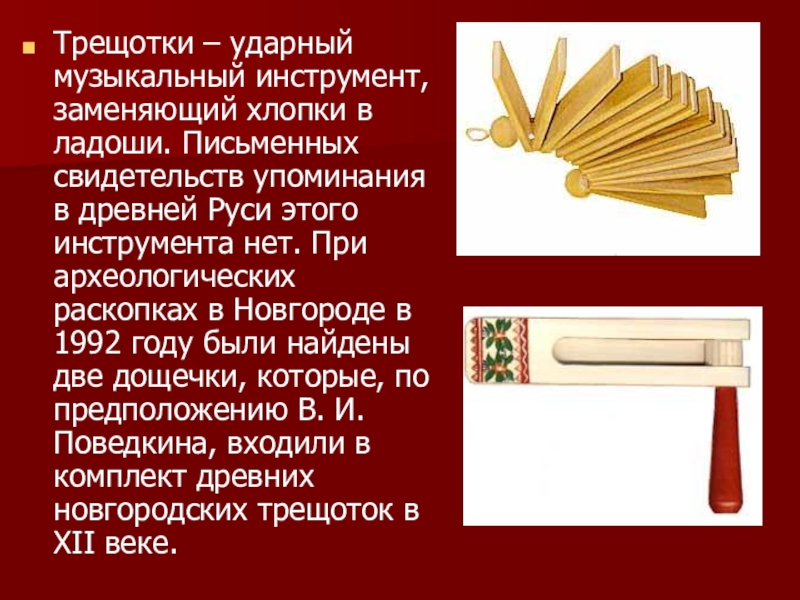 Слайд 34Трещотки – ударный музыкальный инструмент, заменяющий хлопки в ладоши. Письменных свидетельств