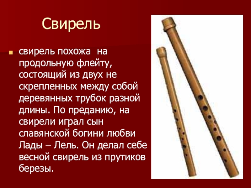собой деревянных трубок разной длины. По преданию, на свирели играл сын славянской богини любви Лады – Лель. Он делал себе весной свирель из прутиков березы.