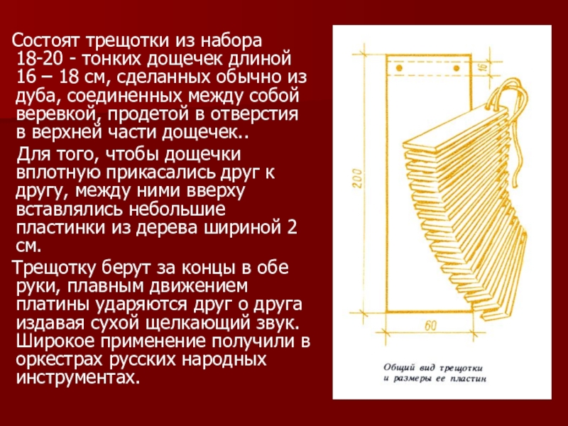 Слайд 35 Состоят трещотки из набора 18-20 - тонких дощечек длиной