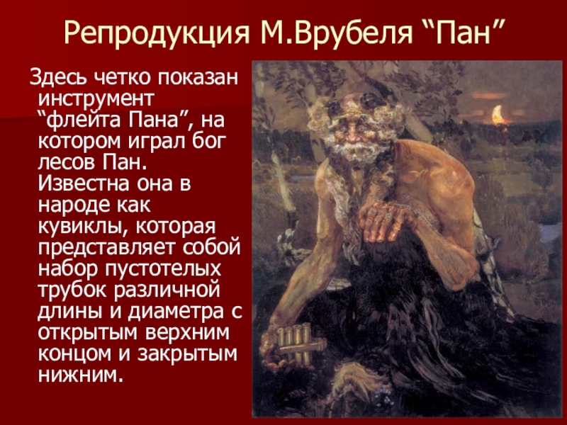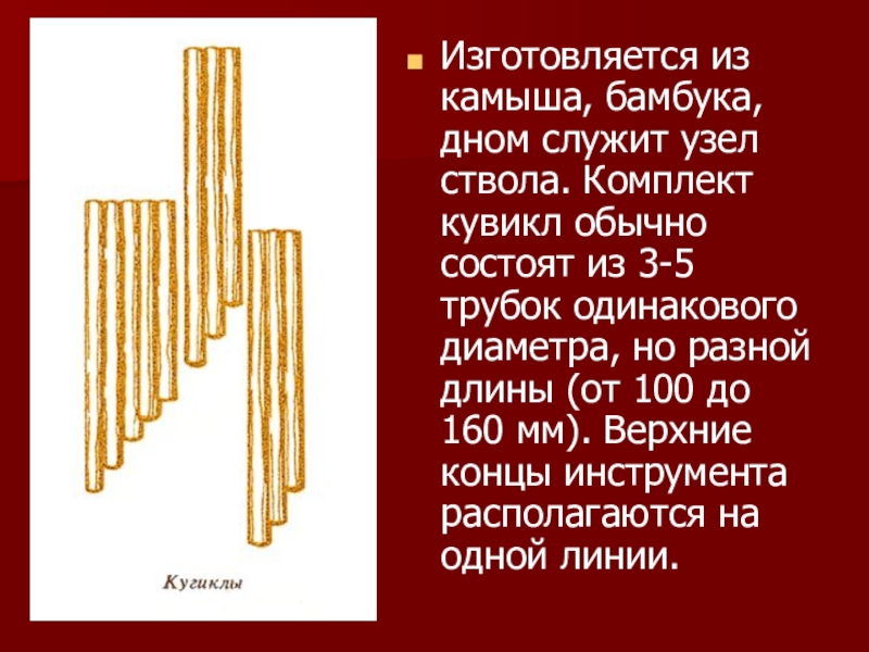 котором играл бог лесов Пан. Известна она в народе как кувиклы, которая представляет собой набор пустотелых трубок различной длины и диаметра с открытым верхним концом и закрытым нижним.
