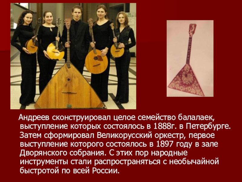 Слайд 11 Андреев сконструировал целое семейство балалаек, выступление которых состоялось в