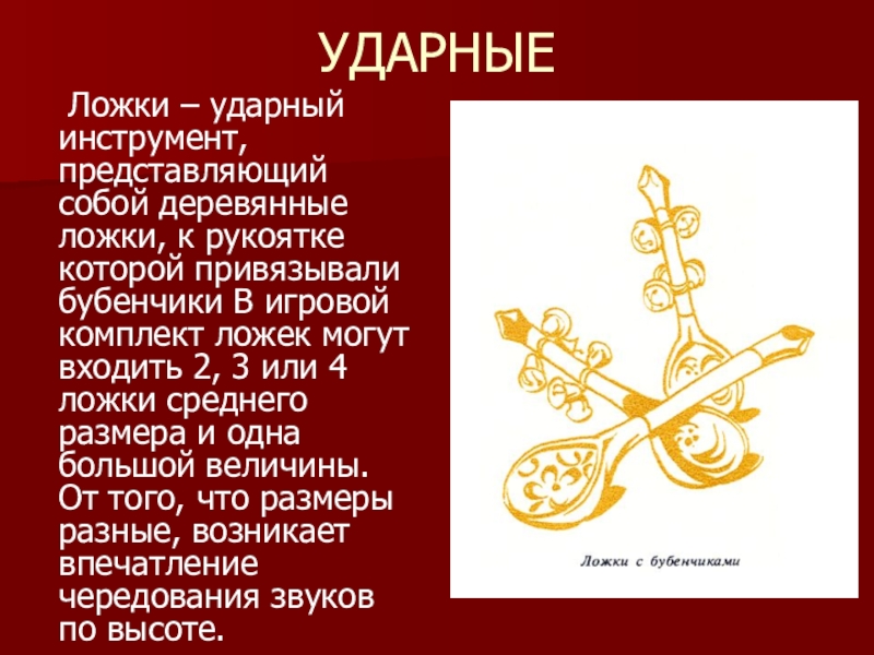 рукоятке которой привязывали бубенчики В игровой комплект ложек могут входить 2, 3 или 4 ложки среднего размера и одна большой величины. От того, что размеры разные, возникает впечатление чередования звуков по высоте.