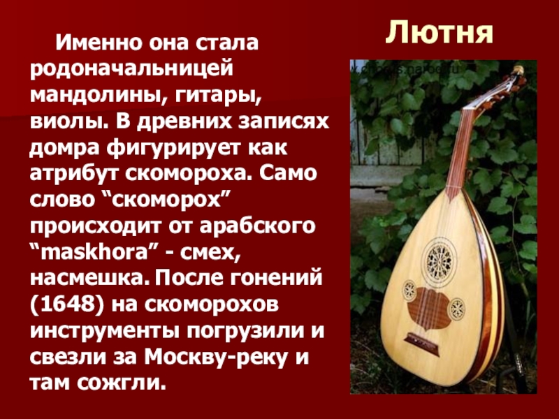 Именно она стала родоначальницей мандолины, гитары, виолы. В древних