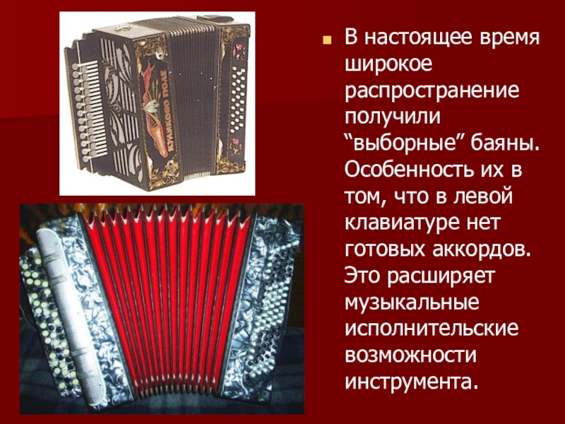 Слайд 15В настоящее время широкое распространение получили “выборные” баяны. Особенность их в