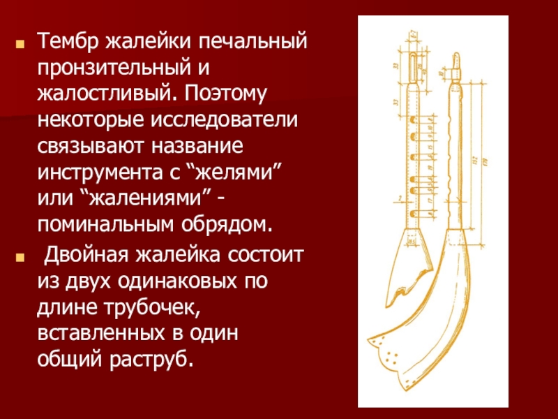 Слайд 20Тембр жалейки печальный пронзительный и жалостливый. Поэтому некоторые исследователи связывают название