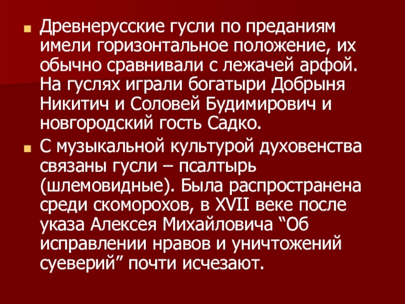 лежачей арфой. На гуслях играли богатыри Добрыня Никитич и Соловей Будимирович и новгородский гость Садко.