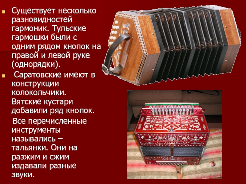 Слайд 14Существует несколько разновидностей гармоник. Тульские гармошки были с одним рядом кнопок