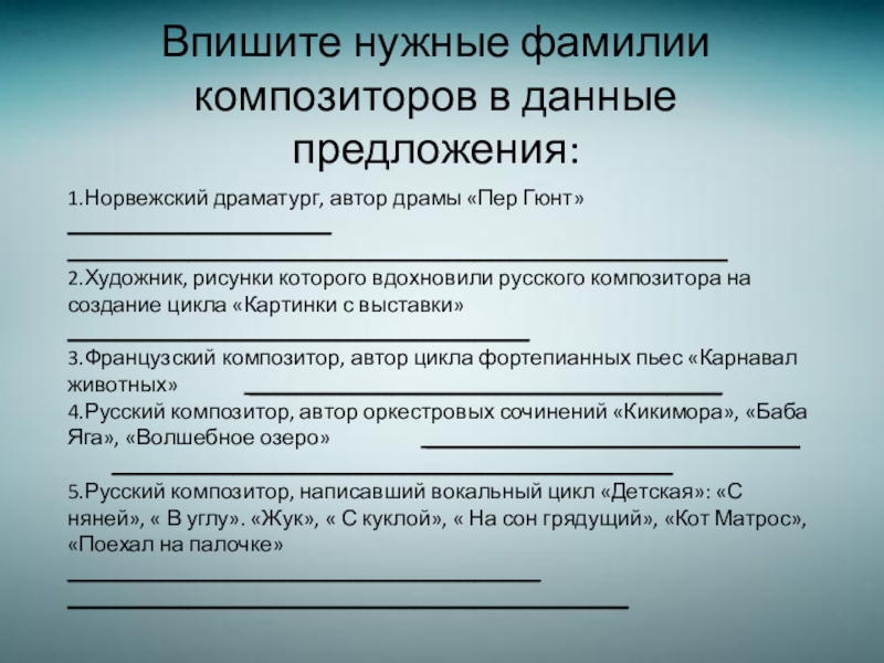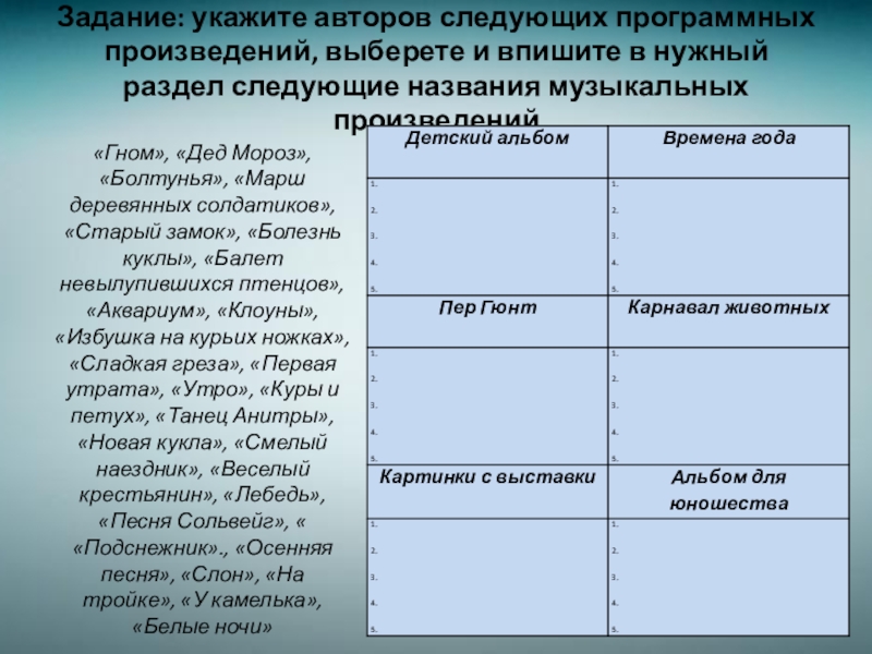 «Гном», «Дед Мороз», «Болтунья», «Марш деревянных солдатиков», «Старый замок», «Болезнь куклы», «Балет невылупившихся птенцов», «Аквариум», «Клоуны», «Избушка на курьих ножках», «Сладкая греза», «Первая утрата», «Утро», «Куры и петух», «Танец Анитры», «Новая кукла», «Смелый наездник», «Веселый крестьянин», «Лебедь», «Песня Сольвейг», « «Подснежник»., «Осенняя песня», «Слон», «На тройке», «У камелька», «Белые ночи»